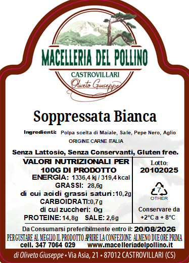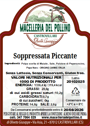 - Pura Genuinità: La nostra Soppressata è realizzata senza alcun conservante aggiunto e garantisce l'assenza di tracce di lattosio. Un prodotto 100% naturale, come vuole la tradizione calabrese.